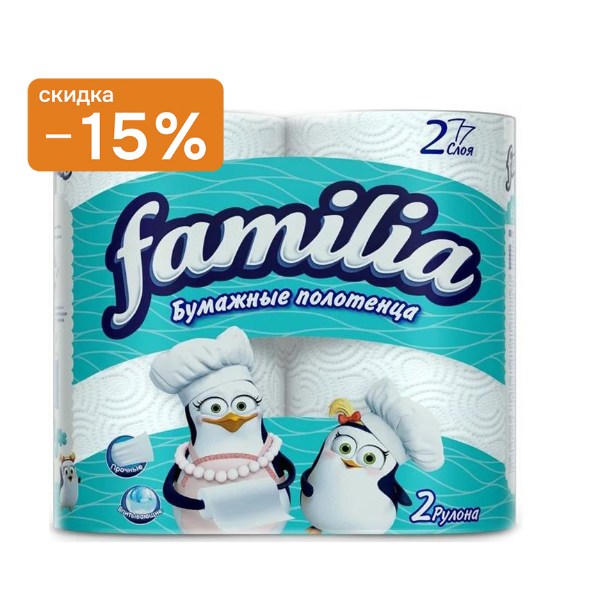 Двухслойные бумажные полотенца Фамилия для кухни и уборки. Компактная упаковка, длинные рулоны, прочные листы, идеально впитывают.