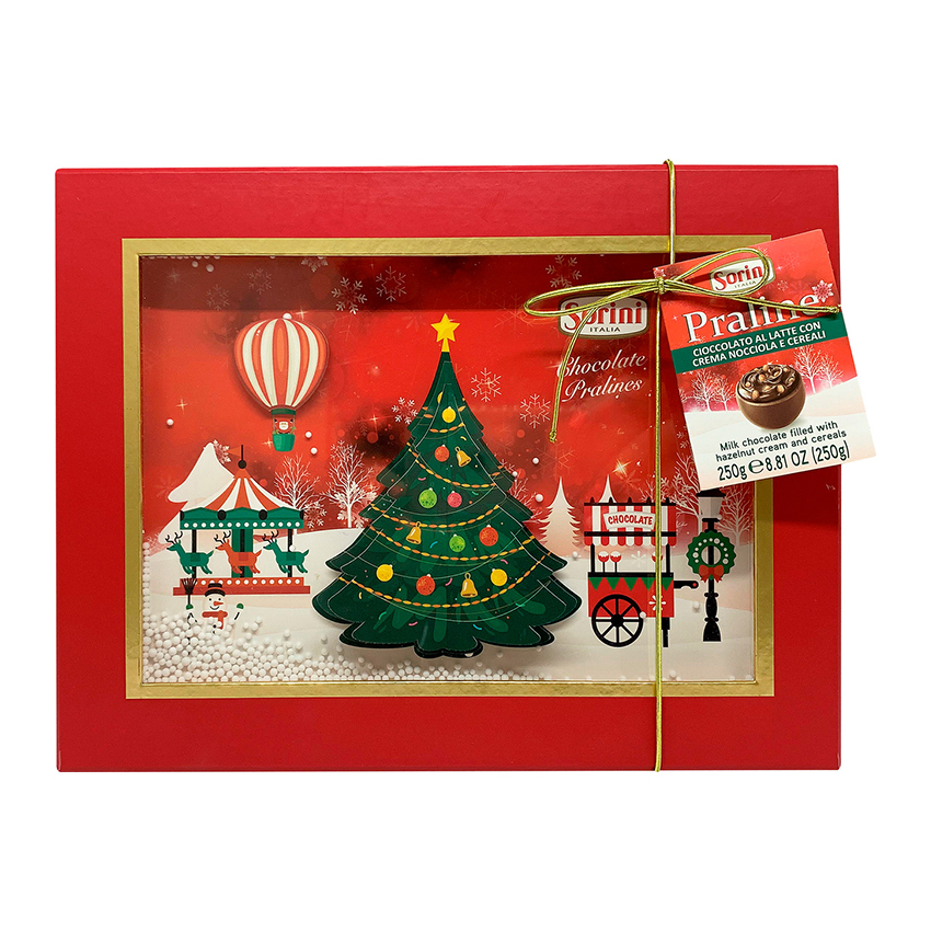 Конфеты Sorini 3D Christmas Box (250 г) — это подарочный набор в праздничной упаковке с новогодним дизайном. Конфеты изготовлены в Италии и сочетают молочный шоколад с начинкой из пралине, фундука и хрустящих злаковых хлопьев.